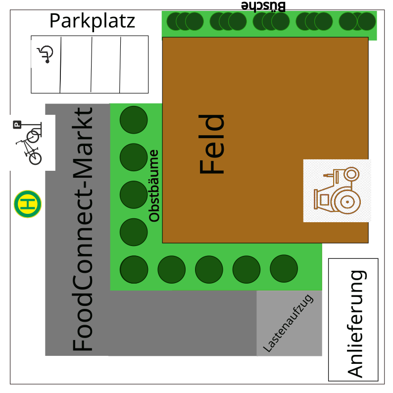 Deswegen haben wir uns schon ein paar Ideen gemacht wie wir vorgehen möchten. Unser Plan ist es, ein L-förmiges Gebäude zu bauen, das ein Feld umschließt, auf dem Gemüse und Getreide angebaut werden. Unser FoodConnect-Markt ist mit öffentlichen Verkehrsmitteln zu erreichen und besitz außerdem mehrere Parkplätze. Da wir noch nicht genau wissen, welche Wünsche die Persona haben, gibt es noch keine feste Raumaufteilung. Auf dem hochgeladenen Plan kann man unseren Entwurf genauer sehen.