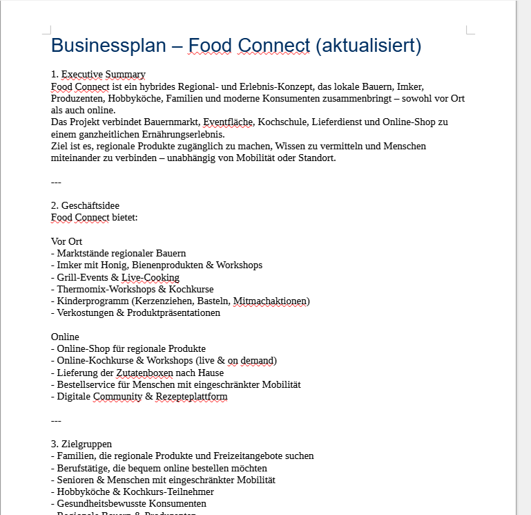 Im Rahmen der Spieltagsaufgabe haben wir einen strukturierten Businessplan für unseren „Food Connect Markt“ entwickelt. Wir haben Standort-, Zielgruppen- und Wirtschaftlichkeitsanalysen durchgeführt und darauf aufbauend ein nachhaltiges, regionales und erlebnisorientiertes Marktkonzept entworfen.